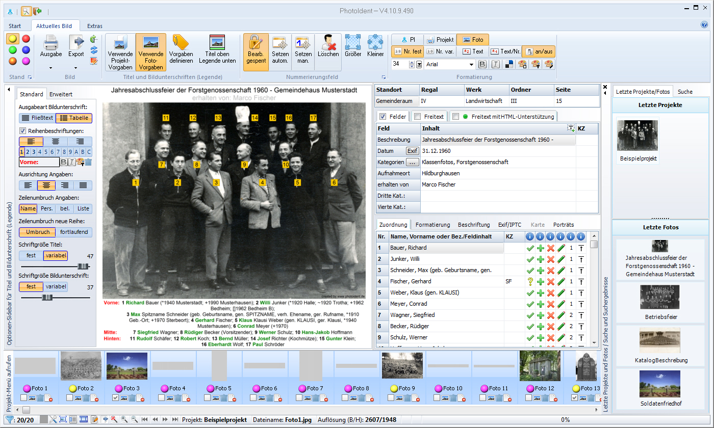 PhotoIdent versucht auf einfache Art und Weise eine Möglichkeit zu schaffen, diese Informationen bei Ihnen, bei Familienmitgliedern oder bei "Zeitzeugen" abzufragen und zu erfassen. Hierfür werden folgende Arbeitsschritte unterstützt: